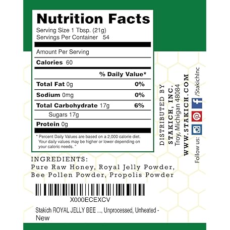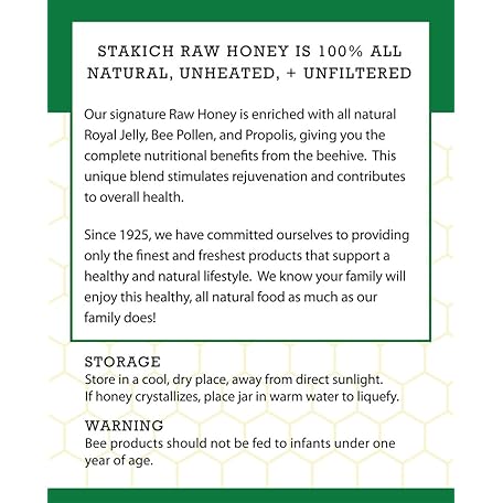 Thông tin sản phẩm Stakich Royal Jelly, Bee Pollen, Propolis Raw Honey - Pure, Unprocessed, Unheated - 40 Ounce