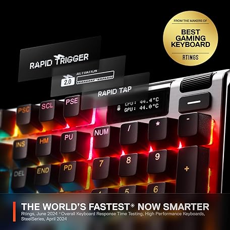 • SteelSeries Apex Pro Gen 3 OmniPoint 3.0 HyperMagnetic Switches — Adjustable Actuation — Rapid Trigger — Game-Ready Presets — Protection Mode — Rapid Tap/SOCD — OLED — RGB — PBT Keycaps — USB-C