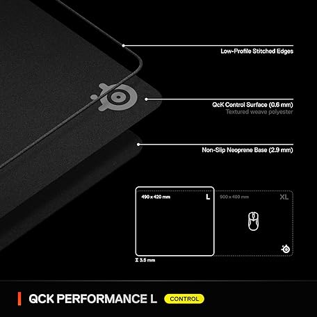 Thông tin sản phẩm SteelSeries QcK L Performance Control Gaming Mousepad — Extra Density for a Smooth Glide — Low-Profile Edge Stitching — Non-Slip Neoprene Rubber Base — 16.54 x 19.29 inch — FPS, MOBAs, RTS, MMO
