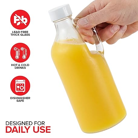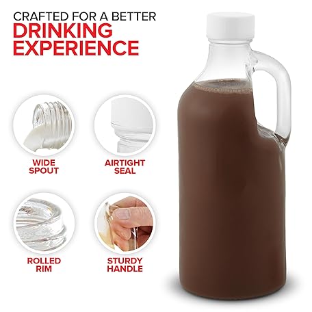 Stock Your Home 40 oz Glass Milk Bottle with Lid and Handle (2 Pack), 4 Reusable Caps, Milk Container for Refrigerator, Glass Juice Bottles, Water, Almond Cow Milk Storage Bottle, Glass Milk Jug