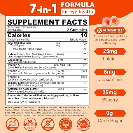 Thông tin sản phẩm Sugar-Free Lutein Zeaxanthin Supplements Gummies (25mg) Vitamins A, C, E, Bilberry, Astaxanthin - Coconut Oil for Better Absorption - Adults & Teens Vision Health, Eye Strain, Dry Eyes - Vegan, 60Cts