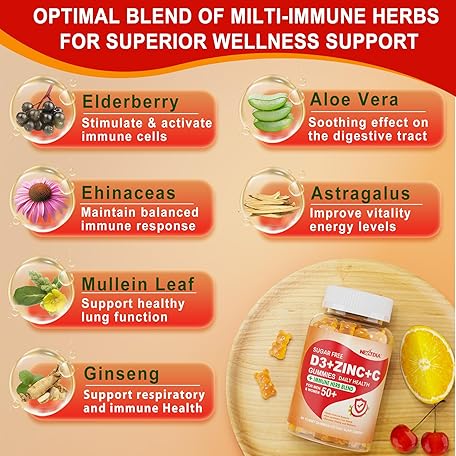 Thông tin sản phẩm Sugar Free Vitamin C + D3 + Zinc Gummies for Adults 50 +, 9 in 1 Immune Defense Supplement with D3 5000IU, Elderberry, Echinacea, Mullein Leaf for Boost Immunity, Power Antioxidant, Vegan (Pack of 2)