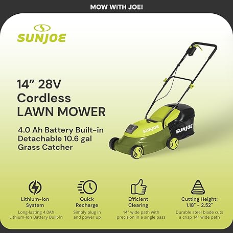 Thông tin sản phẩm Sun Joe MJ401C 14-Inch 28-Volt Cordless Push Lawn Mower, w/10.6-Gallon Collection Bag, 3-Position Height Adjustment, Safety Key, 14 inches, Green