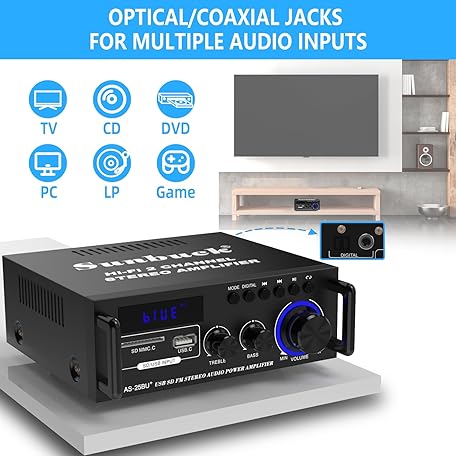 Sản phẩm Sunbuck Small Stereo Amplifier, Stereo Receiver with Bluetooth, Optical/Coaxial Jacks for TV/CD/DVD/LP/PC, Support 192kHz Audio, Max 300Wx2 Power, Home Audio System, Receiver for Speakers, AS-25BU đang được bán với giá ưu đãi là $41.8451 tại nước Mỹ.