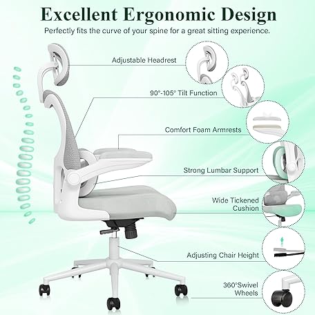 • SUNNOW Ergonomic Office Chair, Comfy Mesh Desk Chair, High Back Computer Gaming Chairs with Adjustable Lumbar Support, Flip-Up Arms, Headrest, Tilt Function, Wide Cushion, Swivel Rolling Wheel (Grey)
