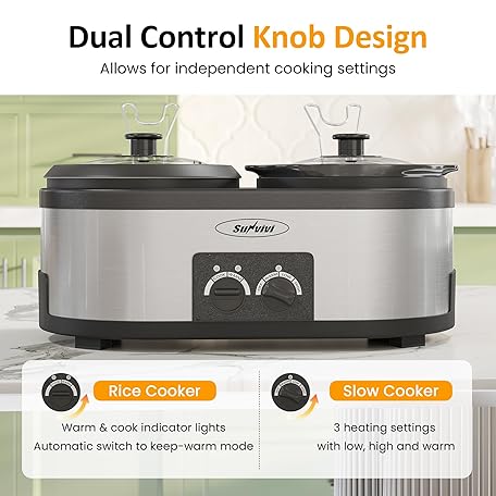 Thông tin sản phẩm Sunvivi 2 in 1 Slow Cooker and Rice Cooker, Slow Cooker with 1.5 QT Ceramic Pot & 3 Temps, Rice Cooker with 3- Cup Non-Stick Aluminum Pot & Indicator Lights, Dual Control Knob, Stainless Steel