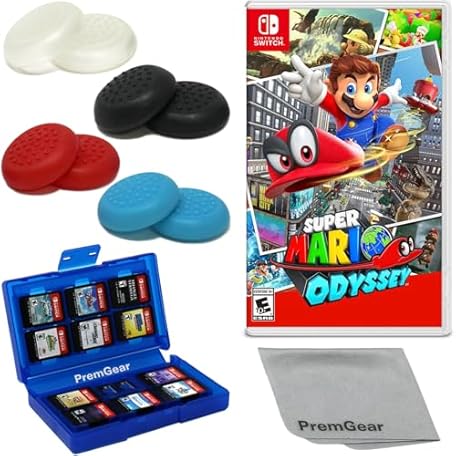 Super Mario Odyssey for Nintendo Switch (US Version), with PremGear Thumb Grips (8 pack - Black, Blue, Red & Clear), 24 Slot Game Card Holder & Cleaning Cloth