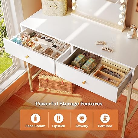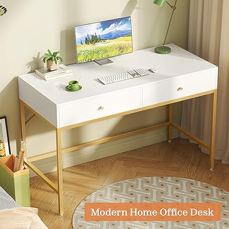 Thông tin sản phẩm SUPERJARE Vanity Desk with Drawers, 47 inch Computer Desk, Modern Simple Home Office Desks, Makeup Dressing Table for Bedroom - White and Gold, 7997G