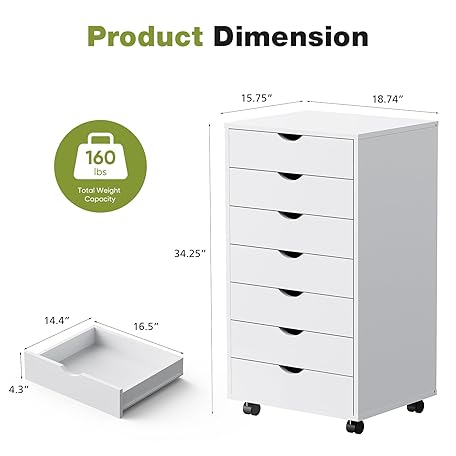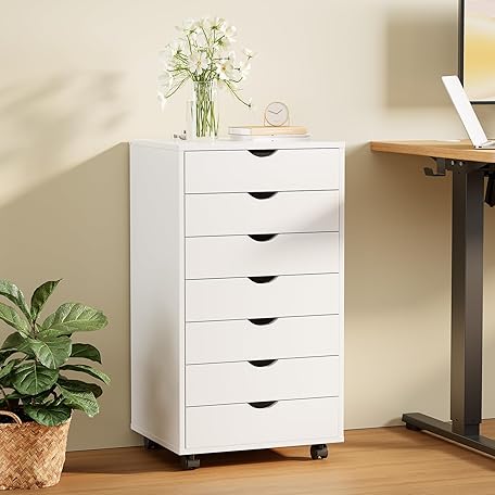 • Sweetcrispy 7 Drawer Chest Mobile Storage Cabinets Wooden Dresser with Wheels Room Organization Furniture for Office, Pure White
