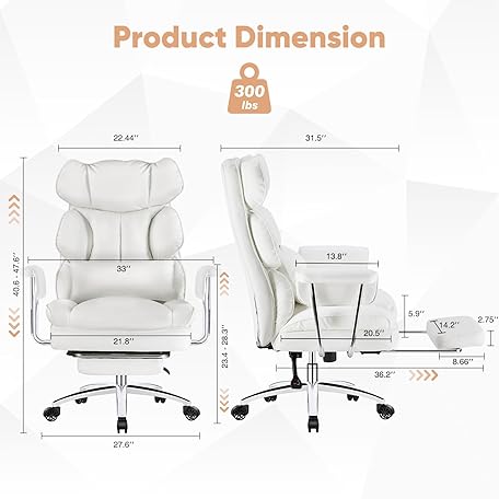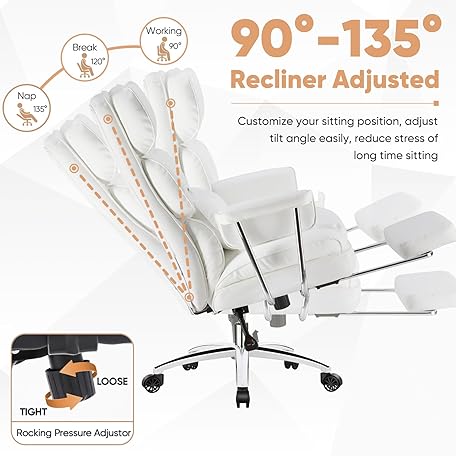 Sweetcrispy Executive Home Office Desk Chair - Ergonomic Big Tall High Back with Footrest & Lumbar Support, Reclining Height Adjustable, Comfy PU Leather Computer Gaming with Swivel Wheels, White