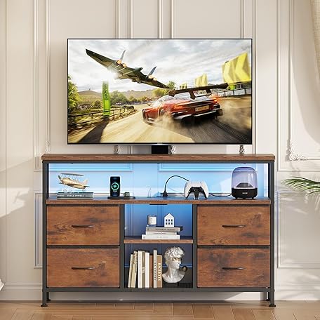 Sweetcrispy TV Stand Dresser for Bedroom 4 Drawers Entertainment Center with LED Lights and Power Outlets Media Console for 50 Inch TV Living Room Furniture with Open Shelf Adjustable Feet, Brown