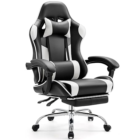 Sweetcrispy Video Game Desk Chair - Ergonomic Computer with Footrest and Comfy Lumbar Support, PU Leather Recliner with Headrest, Fixed Up Armrest, Height Adjustable with 360° Swivel, White, Adults