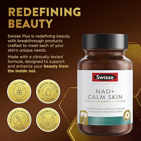 • Swisse Plus NAD+ Calm Skin | Clinically Tested NAD+ Supplement | Supports Balanced, Healthy Skin | Anti-Aging Supplement for Women & Men | 30 Capsules