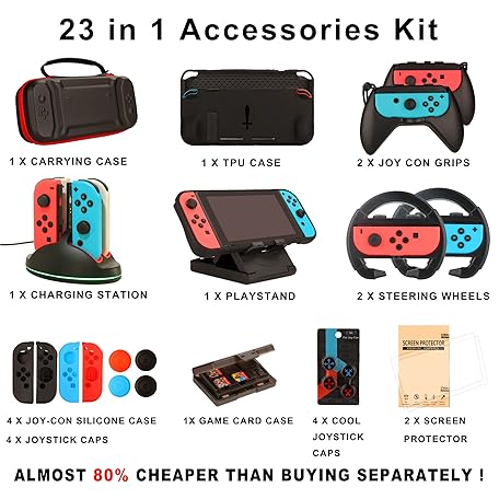 Sản phẩm Switch Accessories Bundle for Nintendo Switch: Carrying Case, Screen Protector, Joycon Grips, Steering Wheels, Charging Dock, Playstand, Comfort Joy-Con Case and More (23 in 1) đang được bán với giá ưu đãi là $37.0491 tại nước Mỹ.