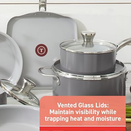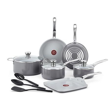 Thông tin sản phẩm T-fal Fresh Gourmet Recycled Ceramic Non Stick Cookware Set 12 Piece, Oven Broiler Safe 500F, Lid Safe 350F, Kitchen Cooking Set W/Fry Pans, Saucepans, Dutch Oven, Utensils, Pots and Pans Set, Grey