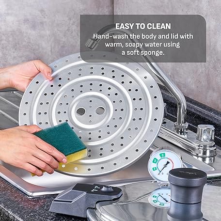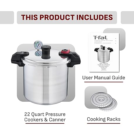 Thông tin sản phẩm T-Fal Pressure Cooker Aluminum Pressure Canner, 22 Quart, 3 PSI Settings, Cookware, Pots and Pans, Large Capacity, Cooling Racks, Recipe Booket, Canning Vegetables, Meats, Poultry, Seafood, Silver