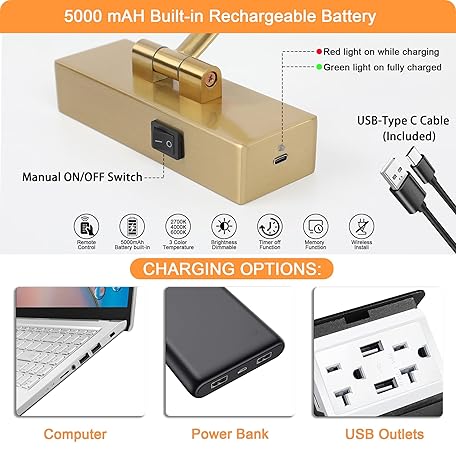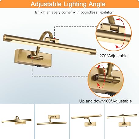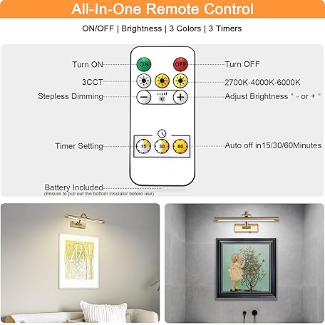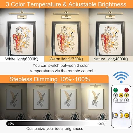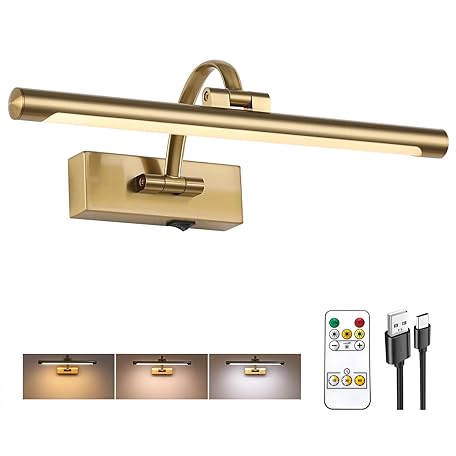 • Tassuowell Wireless Picture Lights for Wall Rechargeable, Battery Operated Art Light for Paintings, 3CCT Dimmable, 15.7" Brass Finish with Remote, Rotatable Gallery Light for Pictures Display