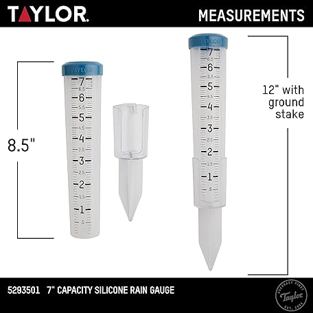 Thông tin sản phẩm Taylor Capacity Break and Freeze Proof Flexible Silicone Rain Gauge, Measure and Monitor Precipitation, Easy to Read for Backyard, Patio, Garden, and Lawn, Post Mount or Ground Stake, 7-inch, Teal