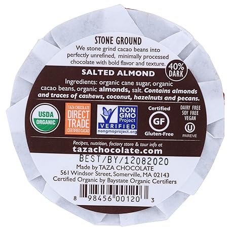 Thông tin sản phẩm Taza Chocolate Organic Mexicano Disc 40% Dark Chocolate, Salted Almond, 2.7 Ounce (1 Count), Vegan