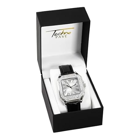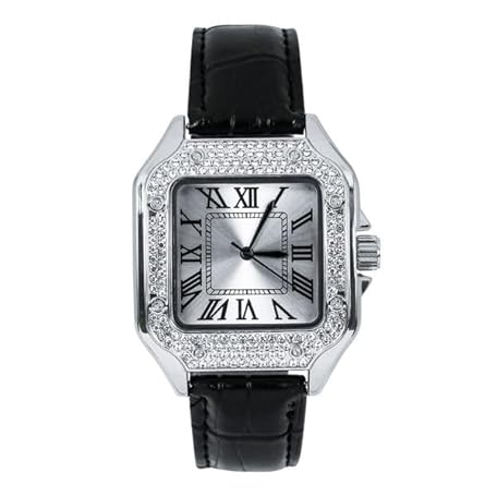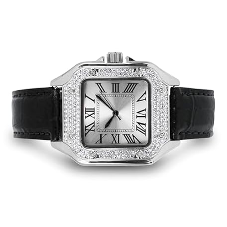 Techno Pave 32mm Iced Out Square Watch – Leather Band, Roman Numerals, Diamond Bezel – Luxury Hip Hop Style for Streetwear & Fashion - Silver Black Finish