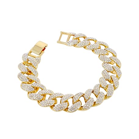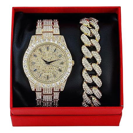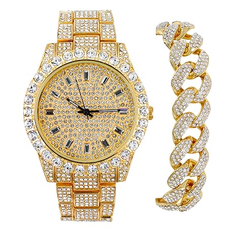 • Techno Pave Mens Fully Iced Diamond Metal Band Watch & Bracelet Set - Gold Baguette Dial & Big Cuban Bracelet
