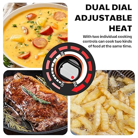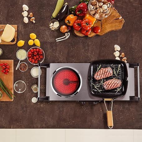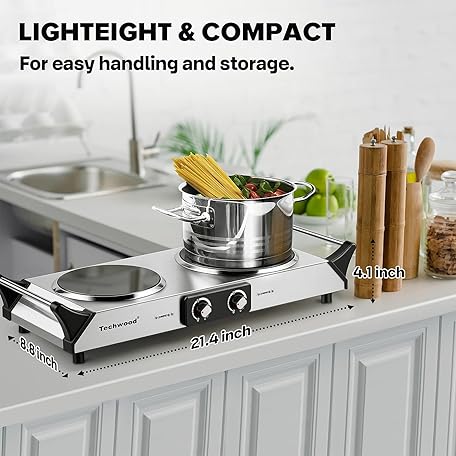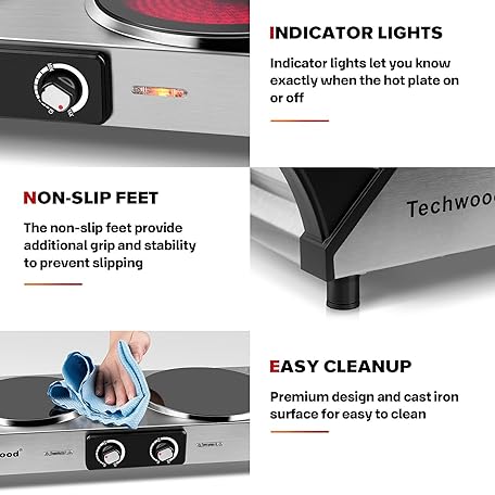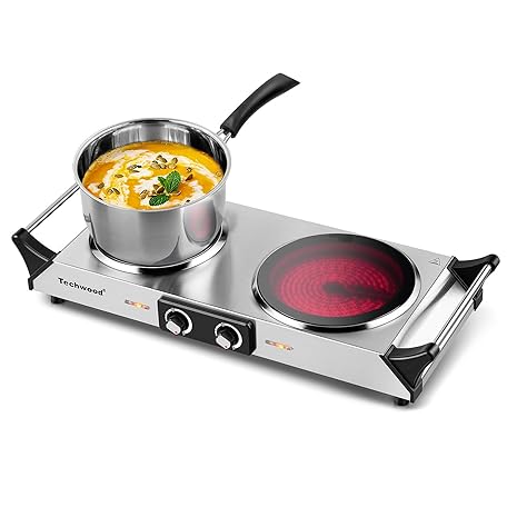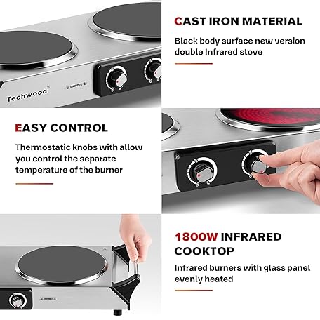 Thông tin sản phẩm Techwood Electric Stove, Double Infrared Ceramic Hot Plate for Cooking, Two Control Cooktop Burner, Portable Anti-scald handles Suitable for Office/Home/Camp Use, 1800W Compatible for All Cookwares