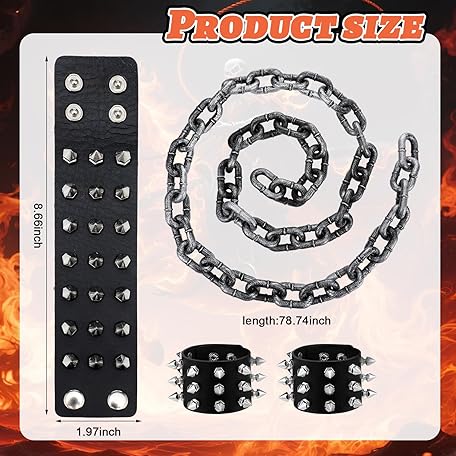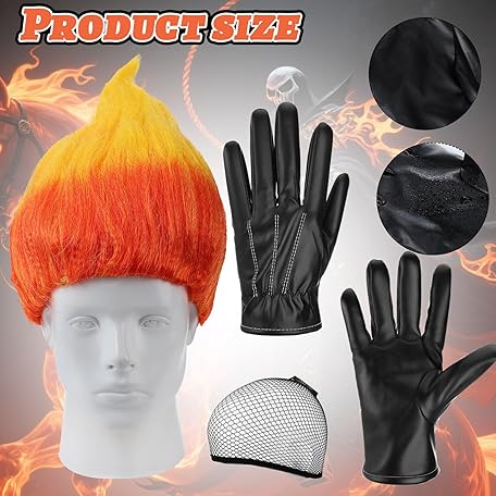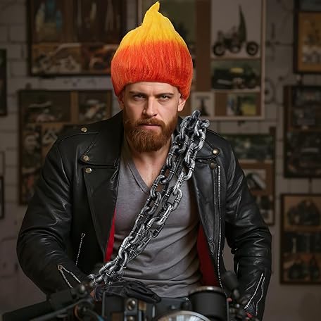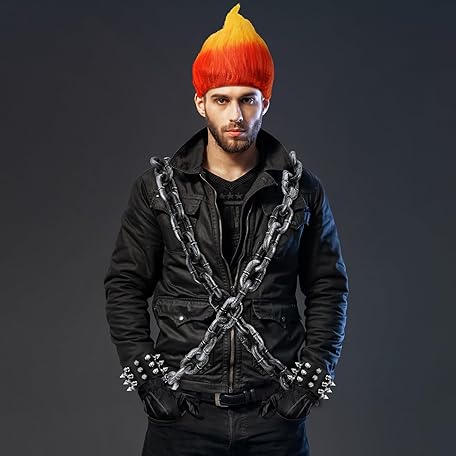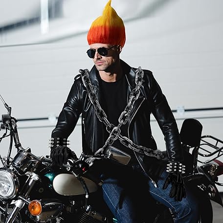 Tellingyou 5 Pcs Halloween Flame Rider Costume Motorcyclist Costume Accessories Include Fire Shape Wig Rivet Bracelet Plastic Chain Prop Leather Gloves for Men Cosplay Party