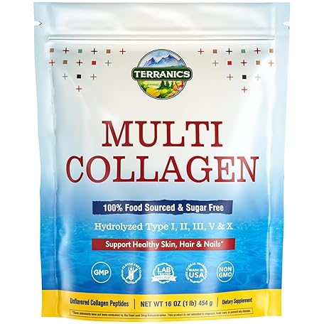 Terranics Multi Collagen Peptides Powder, 1lb, 20g Per Serving, Hydrolyzed Collagen Type I II III V X, Bovine Marine Chicken & Eggshell, No Sugar, Keto, Beauty & Movements Support, Unflavored, 16oz