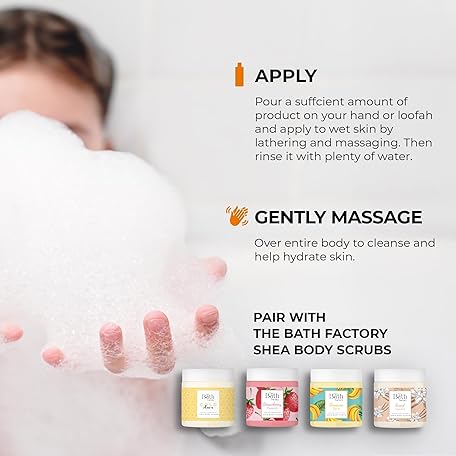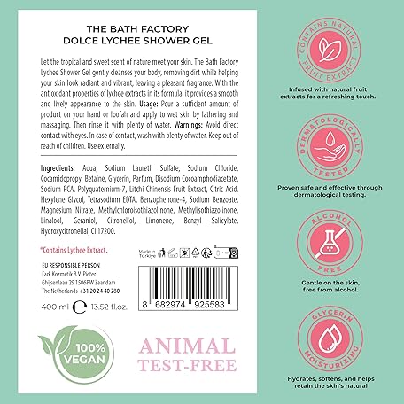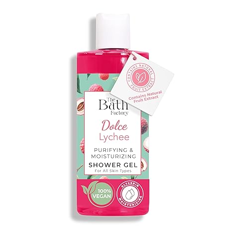The Bath Factory Shower Gel for Body Wash | 100% Vegan & Contains Natural Dolce Lychee Extract | Moisturizing Liquid Soap as Bath Products for Men & Women | 13.5 Fl Oz