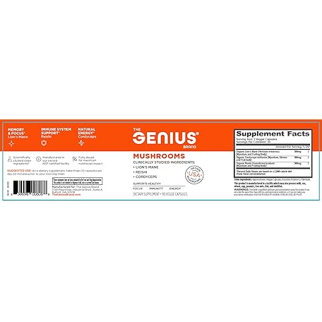 Thông tin sản phẩm The Genius Brand Genius Mushrooms - Plant-Based Supplement for Immune, Focus & Energy Support - Lion's Mane, Cordyceps & Reishi - Organic & Non-GMO - 90 Veggie Capsules