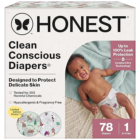 The Honest Company Clean Conscious Diapers for Delicate Skin | Up to 100% Leakproof | Hypoallergenic, Fragrance Free | Winter '25 Limited Edition Prints | Club Box, Size 1 (8-14 lbs), 78 Count