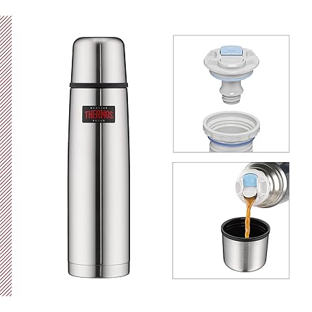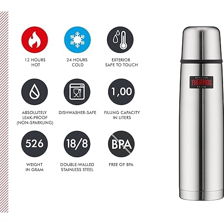 Thông tin sản phẩm Thermos Light & Compact Beverage Bottle, 1 L, Red, Insulated Thermos Flask, Stainless Steel, with Drinking Cup, 12 Hours Hot/24 Hours Cold, Dishwasher-Safe, Completely Leak-Proof, BPA-Free