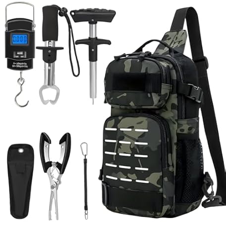 THKFISH 7Pcs Fishing Backpack with Fishing Pliers Kit, Tactical Fish Sling Tackle Bag Included Fishing Tackle kit, Digital Fishing Gear Weight Scale, Fish Hook Remover Tools