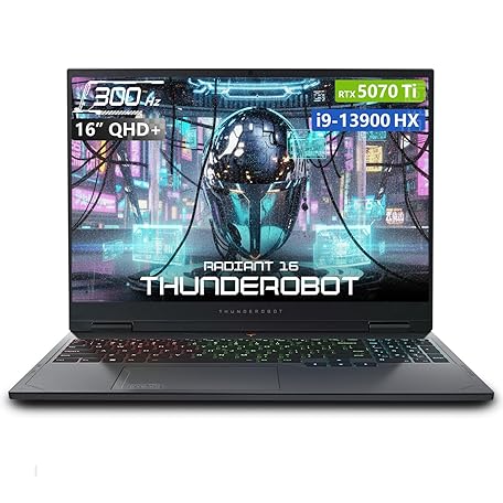 Thunderobot Radiant 16 i9 5070Ti 2.5K 300Hz Gaming Laptop, NVIDIA GeForce RTX 5070 Ti, Core i9-13900HX, 16" QHD+ 300Hz Display, 32GB DDR5, 1TB SSD, RGB Backlit KB, Wi-Fi 6, Win 11 Home, Black