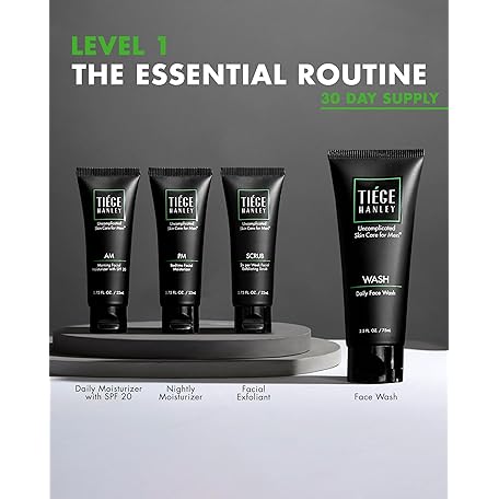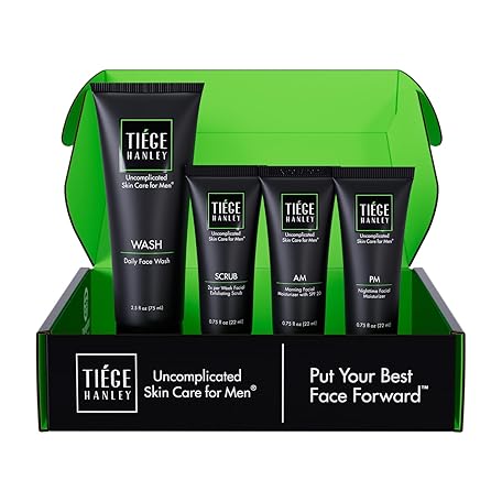 Thông tin sản phẩm Tiege Hanley Skin Care Set for Men, Essential Routine, System Level 1, Daily Face Wash, Facial Scrub, Moisturizer With SPF, and Night Cream for Healthy, Hydrated Skin, Men’s Skin Care, 4 Piece Kit