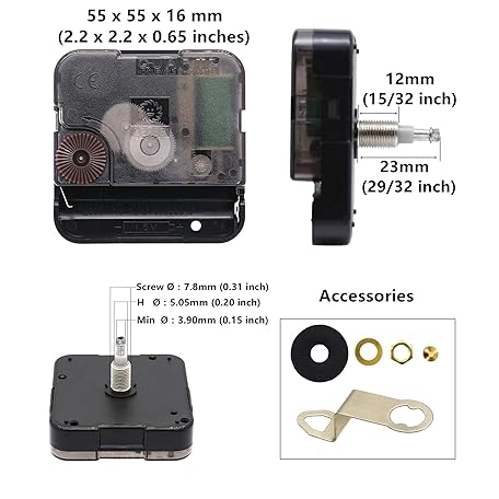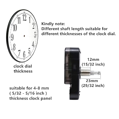 Thông tin sản phẩm TIKROUND Quartz DIY Wall Clock Movement Mechanisms Battery Powered DIY Repair Parts Replacement with 4 Sets Hands,3/10 Inch Maximum Dial Thickness,29/32 Inch Total Shaft Length.