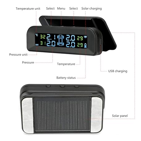 Thông tin sản phẩm Tire Pressure Monitoring System Wireless Solar TPMS, Tire Pressure Monitor Installed on Windowshield with 4 External Sensors Real-time Display Temperature Pressure 22-87 PSI for Car RV SUV MPV Sedan