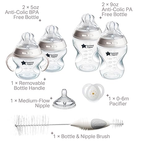 Thông tin sản phẩm Tommee Tippee Natural Start Baby's First Bottle and Pacifier 8 Piece Set, 2 x 5oz and 2 x 9oz Anti-Colic BPA Free Bottles, 2 Extra Slow and Medium Flow Nipples, 2, 0-6 Month Pacifiers, Clear