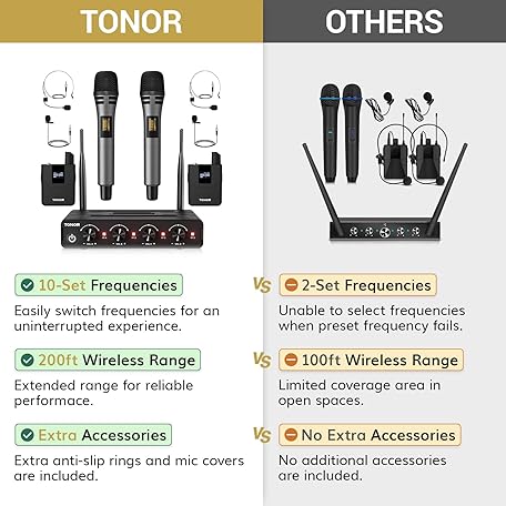 Thông tin sản phẩm TONOR Wireless Microphone System, 4 * 10-Channel UHF Cordless Handheld Mic Set with Headset/Lavalier Lapel Mics, Bodypack Transmitter, Receiver, 200ft Range for Karaoke Singing Church DJ PA Speaker
