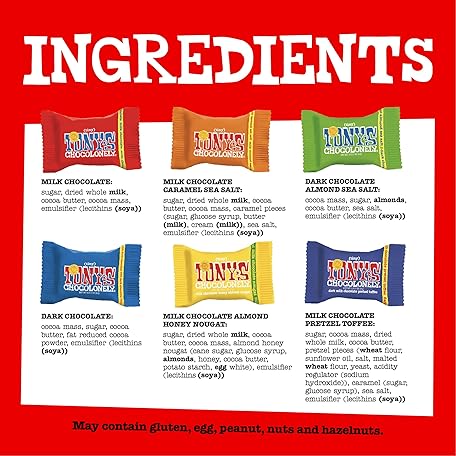Thông tin sản phẩm Tony’s Chocolonely Assorted Chocolate Candy Pieces, Belgian Milk & Dark Chocolate, Caramel Sea Salt, Almond Sea Salt, Honey Almond Nougat, Pretzel Toffee, Made From Quality Fairtrade Cocoa, 4.44 Oz