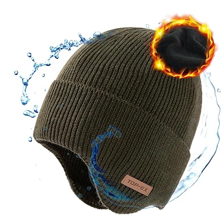 TOP-EX DryKnit? Waterproof Fleece Lined XL XXL Ear Flap 50% Merino Wool Cold Weather Ski Running Beanies