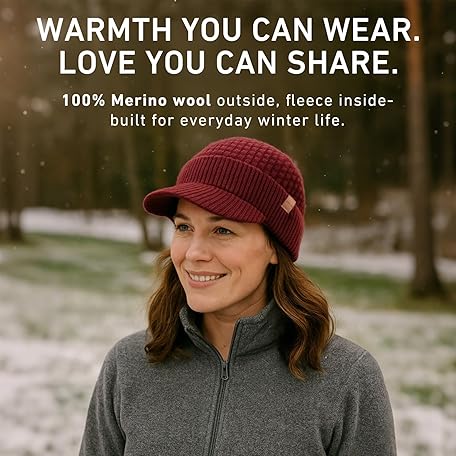 • TOP-EX PolarWool™ 100% Merino Wool Winter Hat for Men Fleece Lined Visor Beanie with Brim Outdoor Knit Cap for Cold Weather