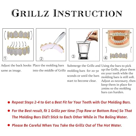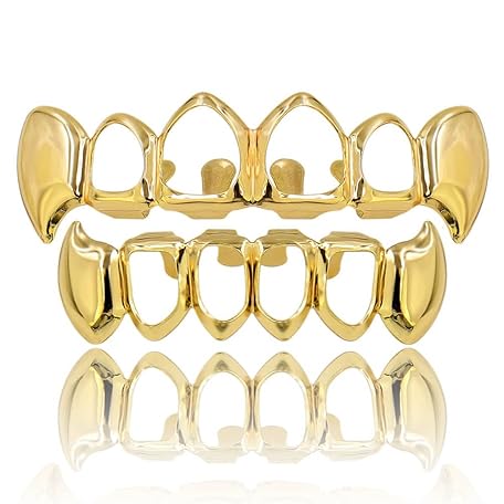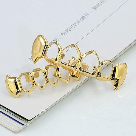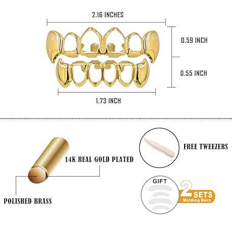 TOPGRILLZ Vampire Teeth Grillz - Grills for Your Teeth, 14K Gold Plated Vampire Fangs Open Face Gold Grillz for Men Women Hip Hop Cosplay Rapper Costume Accessory (Extra 2 Molding Bars)