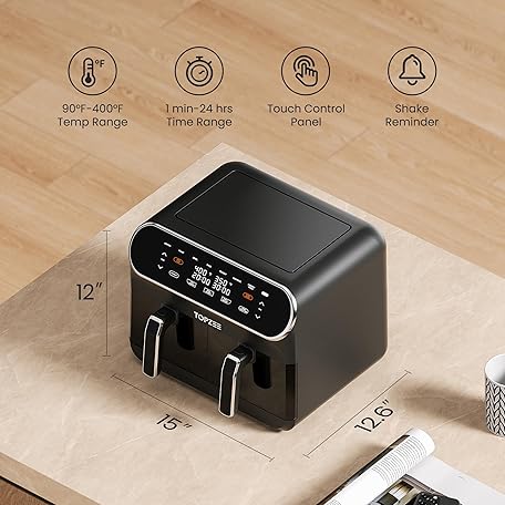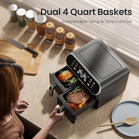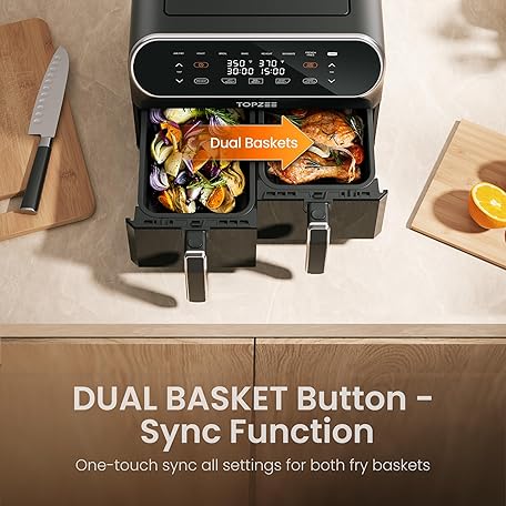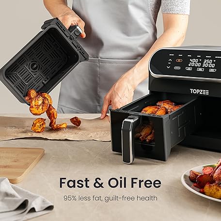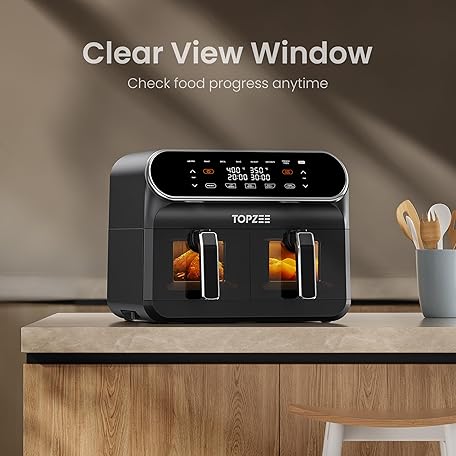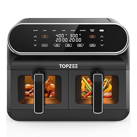 TOPZEE 8 Quart Large Air Fryer - Dual Basket Airfryer with Easy View Windows, Preheat, Air Fry, Roast, Broil, Bake, Dehydrate, 2 Independent 4 QT Nonstick Dishwasher Safe Baskets, Black