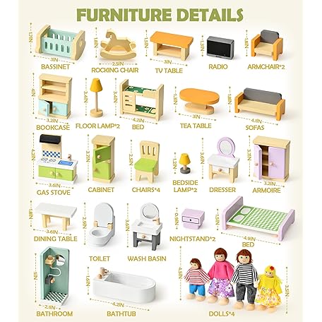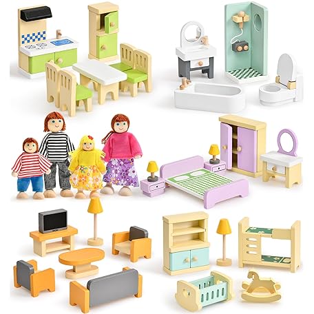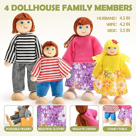 Toyssa Wooden Dollhouse Furniture Set, 36PCS Miniature Doll House Accessories with Colorful 5 Room & 4 Flexible Family Dolls, Pretend Play Toys Birthday Gift for Toddlers 3 4 5 6 Years Old