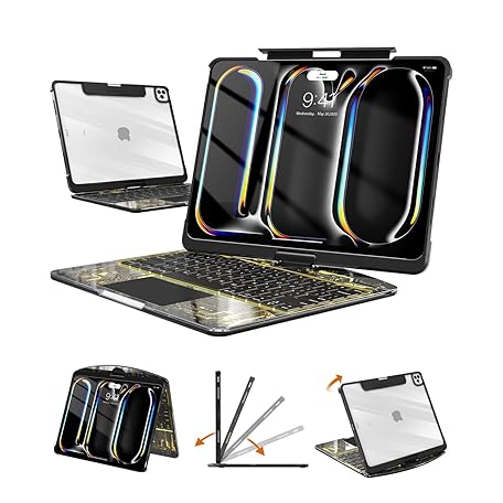 Transparent Keyboard Case for iPad Pro 11" (M5/M4, 2025/2024) Wireless Keyboard with 7 Colors Backlight, 360° Rotatable Protective Case with Pencil Holder, Multi-Touch Trackpad, Thin & Light, Black