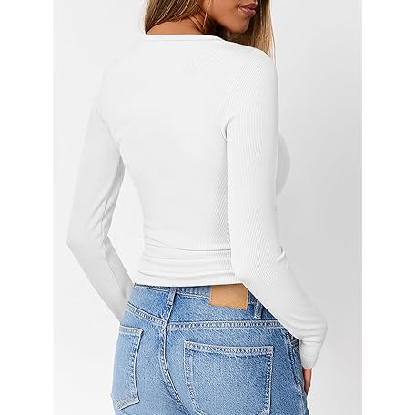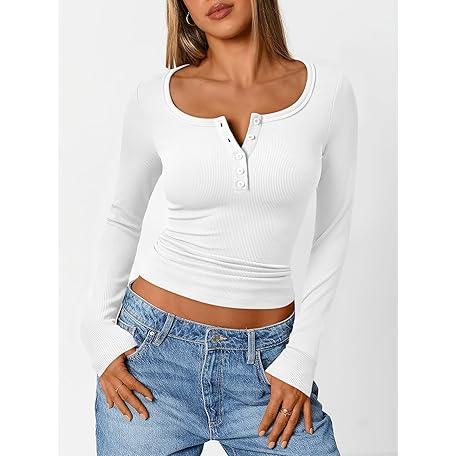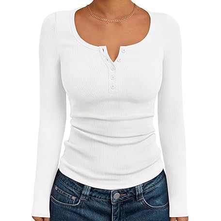 • Trendy Queen Long Sleeve Shirts for Women Henley Ribbed Fall Tops Dressy Business Casual Teen Girl Winter Cute Basic Tees