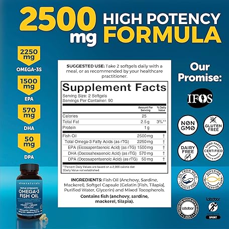 Thông tin sản phẩm Triple Strength Omega 3 Fish Oil Supplement for Women and Men – 2500 mg High-Potency, Easy-to-Absorb Re-esterified Triglyceride Form, Pescatarian-Friendly DPA EPA DHA Omega 3 Supplement, 180 Softgels