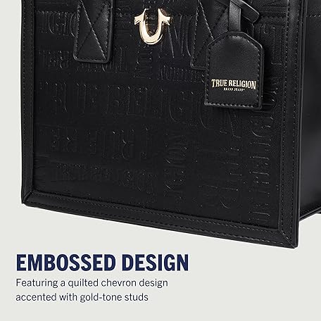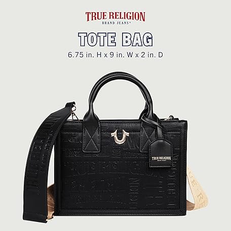 True Religion Mega Logo Modern Tote, Structured Everyday Shoulder Bag, Adjustable Crossbody Strap, Spacious Interior, Black