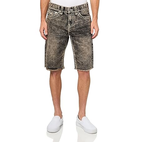 True Religion Men's Ricky Super T Flap Short with Fray Hem - Retro Active Acid Wash Denim Shorts